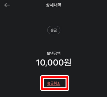 2. 내역 화면에서는 송금한 대상, 금액, 보낸 시간이 표시됩니다. 금액 아래쪽을 보면 송금 취소 버튼이 보이는데요. 이 버튼을 누르면 바로 취소가 가능합니다. 만약 채팅방에서 메시지가 위로 밀려 찾기 어려운 상황이라면 다른 방법을 사용할 수도 있습니다.