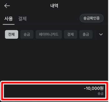 5. 사용 내역 화면에 들어가면 그동안 보냈던 송금 기록이 정리되어 있습니다. 상대방이 아직 돈을 받지 않았다면 여기에서도 취소할 수 있는데요. 취소할 송금 내역을 찾아서 눌러주세요.