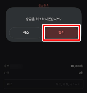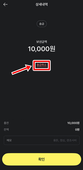 6. 선택한 내역을 보면 송금 취소 버튼이 표시됩니다. 이 버튼을 누르면 최종 확인 창이 뜨는데요. 취소를 확정하면 돈이 내 카카오페이머니로 다시 돌아옵니다. 이렇게 하면 실수로 보낸 돈도 손쉽게 되찾을 수 있습니다.