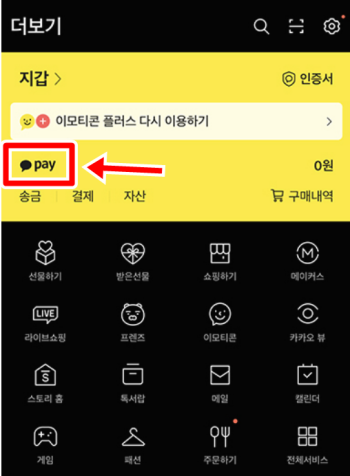 3. 카카오톡 화면 하단을 보면 여러 메뉴가 있는데요. 그중에서 점 세 개로 표시된 버튼을 누르면 더보기 화면으로 이동할 수 있습니다. 이곳에서 pay라고 적힌 아이콘을 찾은 후 선택하면 카카오페이 관련 페이지로 넘어가게 됩니다.
