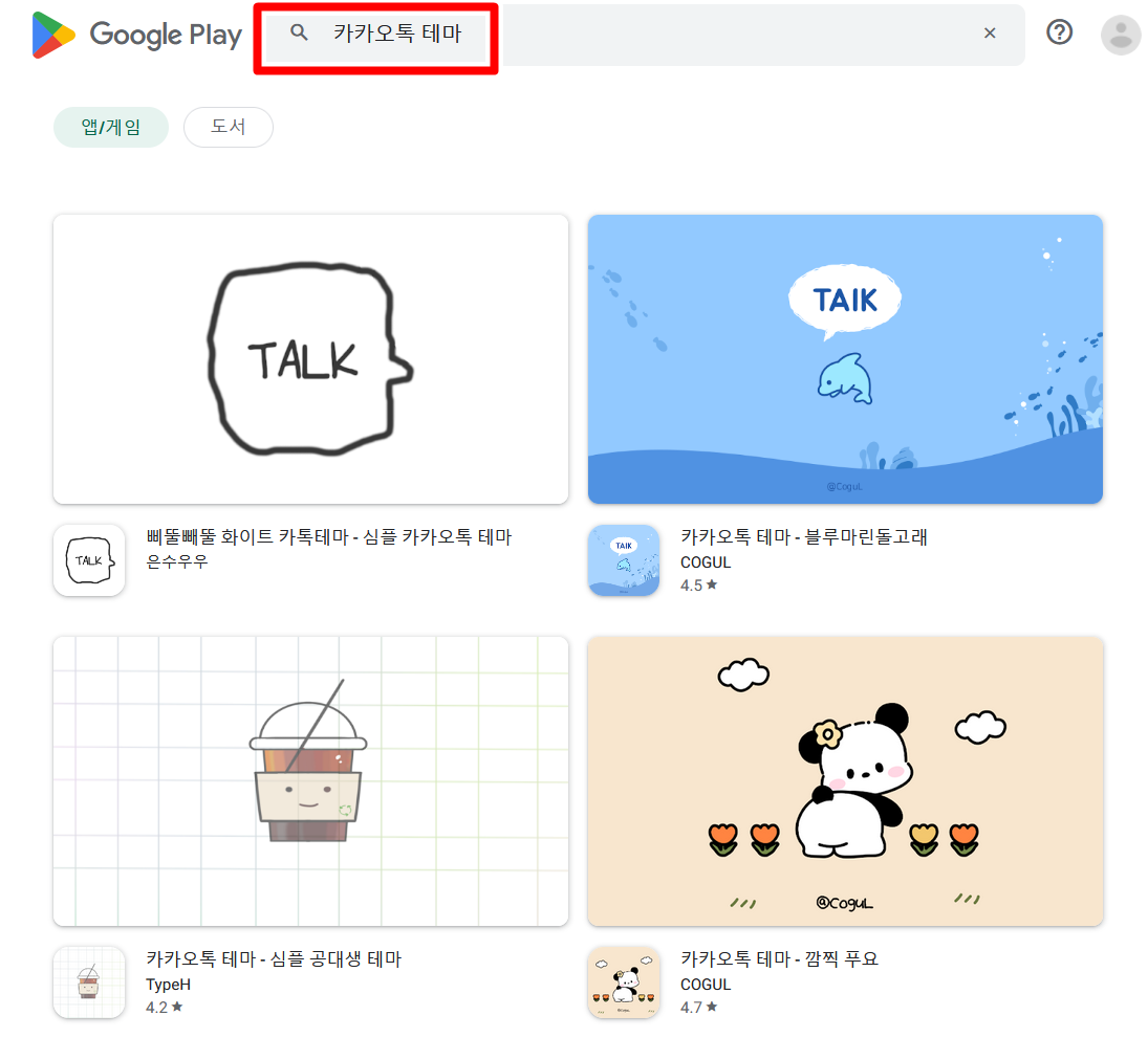 6. 더 다양한 테마가 궁금하다면 구글 플레이 스토어에서 ‘카카오톡 테마’라고 검색해 보세요. 아기자기하고 감성적인 테마들을 쉽게 찾아볼 수 있습니다.