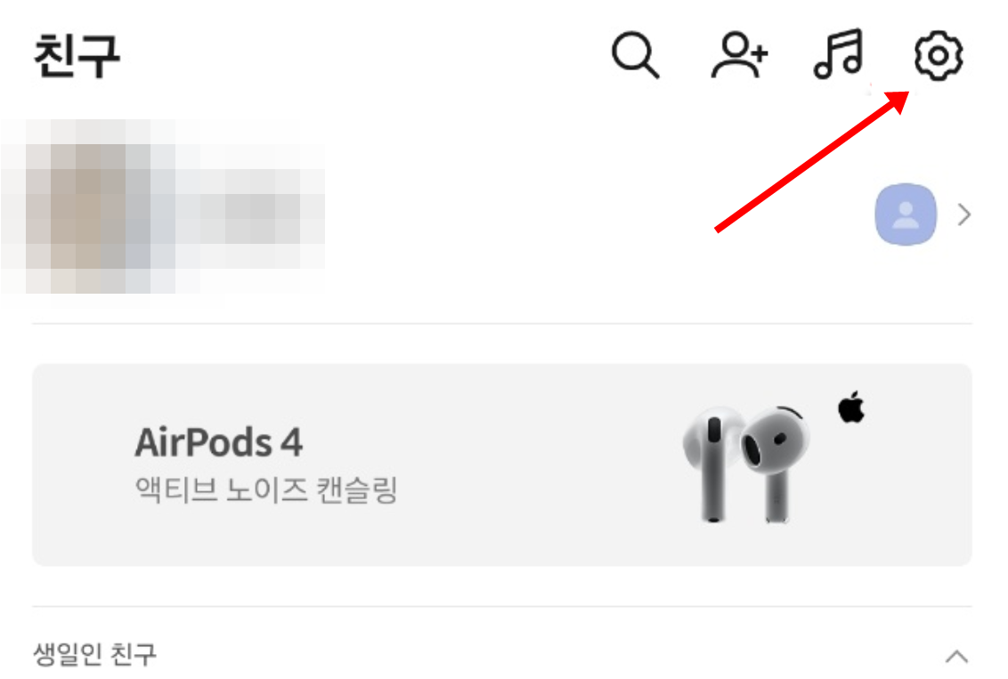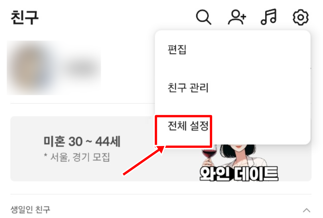 1. 친구 목록 화면에서 오른쪽 위에 있는 설정 아이콘을 눌러 주세요. 여기를 통해 전체 설정 메뉴로 이동할 수 있습니다.