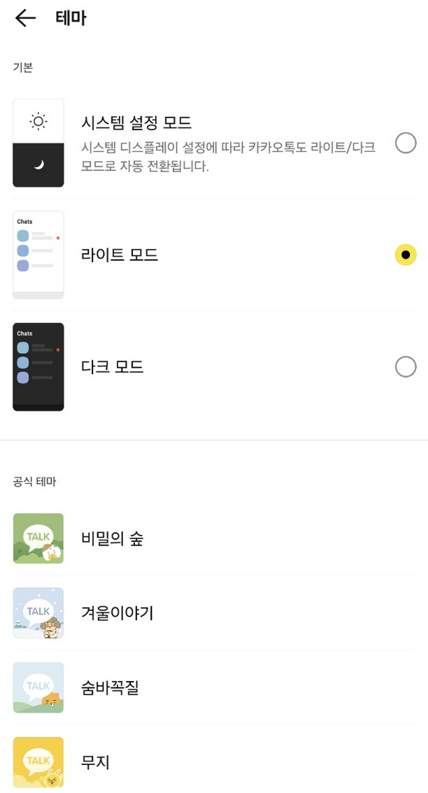 4. 테마 메뉴에서는 라이트 모드, 다크 모드, 시스템 설정 모드 중 하나를 선택할 수 있고, 아래에는 공식 테마들도 다양하게 보여집니다.