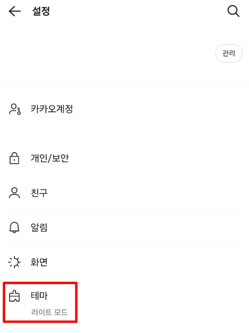 3. 전체 설정 화면으로 들어가면 여러 항목이 보이는데, 아래쪽에 있는 ‘테마’를 눌러주세요. 이 항목에서 기본 배경이나 모드를 바꿀 수 있어요.