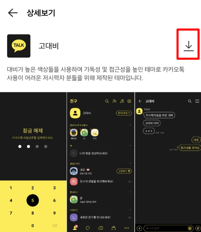 5. 원하는 테마를 고르면 설명이 나오는 화면으로 넘어갑니다. 예를 들어 ‘고대비’ 테마는 시인성이 좋아 눈에 잘 들어오고, 이곳에서 바로 적용할 수 있어요.