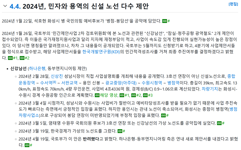 '신강남선' 등 복수의 노선이 제안되었고, 노선에 대한 재정사업과 민자사업 심사가 진행되는 과정이 기록되어 있습니다. 특히 신강남선(봉담-수서) 노선은 B/C 0.9~1.06으로 경제성이 계산되었으나, 차량기지 문제 등 세부 내용에 대한 지자체 간의 입장이 달랐음이 나타나 있습니다.