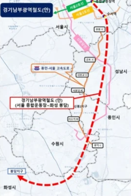 경기도 화성 봉담지구에서 시작하여 수원, 용인, 성남을 거쳐 서울의 수서역과 종합운동장으로 이어지는 노선이 구상되어 있습니다. 노선은 기존 신분당선 및 서울 2호선, 3호선 등과 연계되는 지점도 표시하고 있습니다. 이 철도 노선은 수도권 남부와 서울을 잇는 중요한 교통축 역할을 할 것으로 보입니다.
