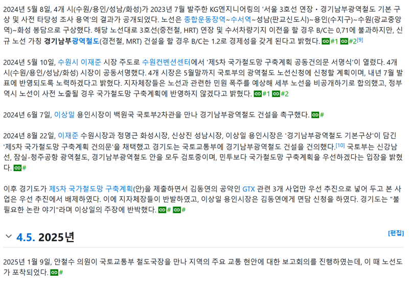 5월에는 4개 시 시장이 공동건의문을 제출했고, 8월에는 '경기남부광역철도 건설'을 국토부에 재차 건의했습니다. 이후 경기도는 GTX 관련 사업을 우선시하는 태도를 보였고, 이에 지자체들이 반발하며 논의를 지속했습니다. 2025년 1월에는 국토부 회의에서 노선이 주요 현안으로 다루어진 사실이 확인됩니다.