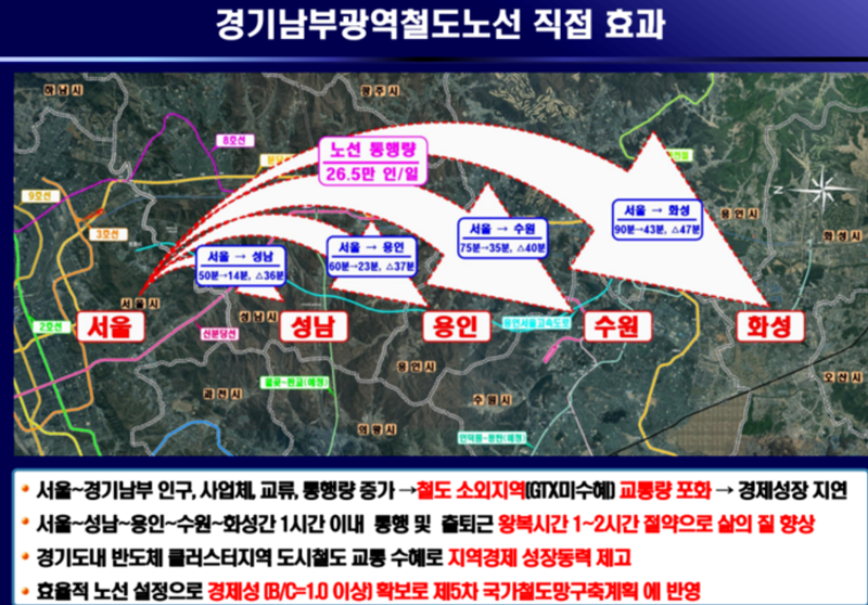 노선 개통 시 예상되는 하루 노선 이용 인원은 26.5만 명입니다. 서울에서 화성까지는 47분, 수원까지 40분, 용인까지는 37분, 성남까지는 36분 통행 시간이 단축될 것으로 예상됩니다. 이로써 지역 주민들의 통행 시간이 대폭 절약될 것입니다.