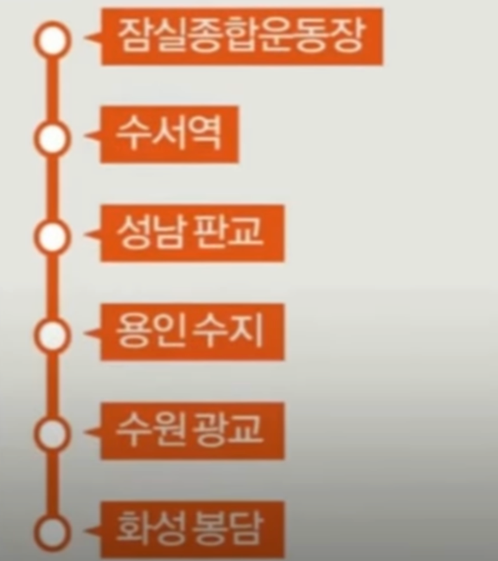 북쪽에서부터 잠실종합운동장, 수서역, 성남 판교, 용인 수지, 수원 광교, 그리고 화성 봉담에 이르는 주요 거점들이 표시되어 있습니다. 이 역들을 통해 경기 남부의 핵심 도시들이 서울과 더욱 가깝게 연결될 예정입니다.