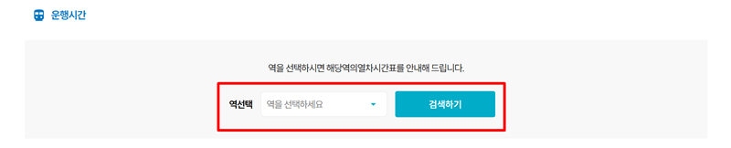 내가 탈 역이 어디인지 정확히 지정하는 단계인데 화면 중앙에 보이는 역선택 박스를 눌러서 평소 자주 이용하는 정거장 이름을 골라주세요. 그 옆에 있는 하늘색 검색하기 항목을 눌러주면 해당 지점의 상세한 운행 정보를 한눈에 볼 수 있도록 정리되어 나옵니다.