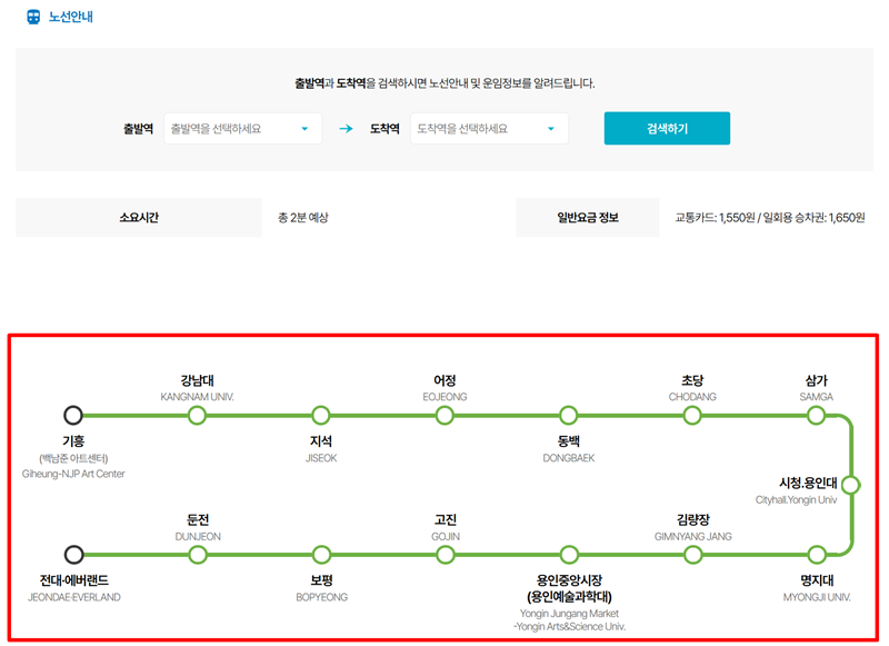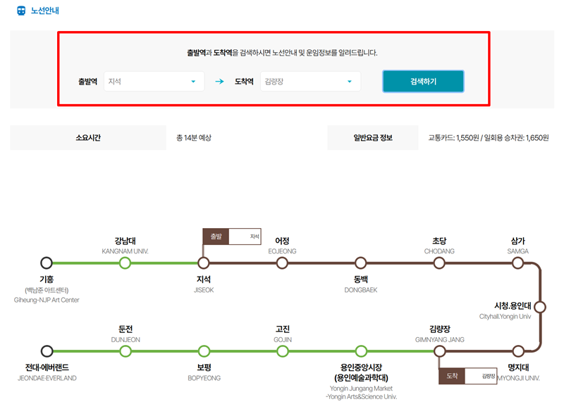 마지막으로 내가 갈 곳의 요금과 걸리는 시간이 궁금하다면 출발지와 도착지를 각각 입력한 뒤 다시 한번 찾아보기를 진행해주세요. 지석역에서 김량장역까지 가는 경우를 보니 예상 소요 시간은 14분이고 교통카드 기준으로 1,550원이라는 구체적인 비용까지 알려주어 여행 계획을 세울 때 큰 도움이 됩니다.