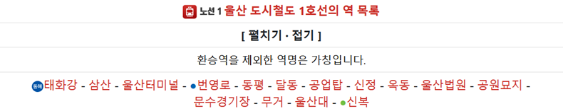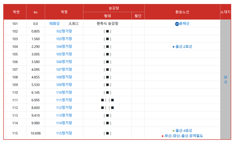 정거장 목록을 좀 더 자세히 들여다보면 다른 교통수단과의 연계성이 돋보입니다. 시작점인 101번 정거장(태화강역)에서는 동해선 광역전철로 편리하게 환승할 수 있습니다. 104번 정거장에서는 남북을 잇는 도시철도 2호선과 만나고, 종점인 115번 정거장(신복로터리)에서는 4호선 및 부산-양산-울산 광역철도와도 연결될 예정이어서, 울산을 중심으로 한 광역교통망의 허브 역할까지 수행하게 됩니다.