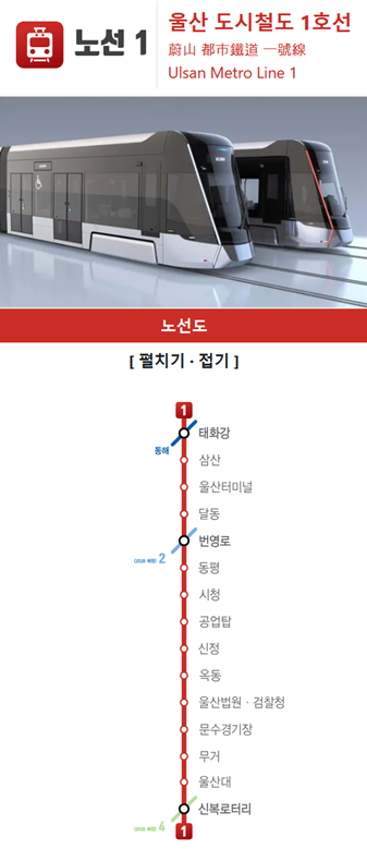 새로운 교통 계획을 접하면 노선도를 통해 한눈에 파악하고 싶어지죠. 울산 도시철도 1호선은 동쪽의 태화강역에서 시작하여 서쪽의 신복로터리까지 울산의 중심부를 동서로 관통하는 노선입니다. 노선도에는 세련된 디자인의 트램 모습과 함께 주요 경유지가 표시되어 있어 기대를 더하는데요, 특히 중간에 2호선, 종점에서 4호선과 환승할 수 있도록 계획되어 있어 울산 도시철도망의 핵심적인 역할을 할 것으로 보입니다.
