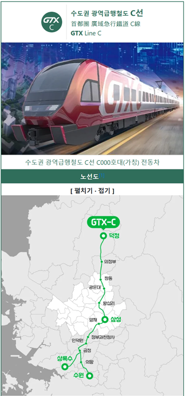 C노선은 총 14개의 역으로 구성되며 사업 시행은 현대건설 컨소시엄인 지티엑스씨 주식회사가 맡았습니다. 2031년 이후 개통을 목표로 사업이 추진 중이며 한국철도공사에서 운영을 담당할 예정입니다. 기점인 덕정역에서 종점인 수원역과 상록수역까지 중전철 차량이 투입됩니다. 노선의 상징색은 진녹색으로 지정되었으며 덕정차량기지와 병점주박기지를 활용해 열차를 관리합니다.